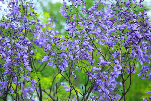 蓝花楹的花是蓝紫色的,是大海的颜色,朵朵小花簇傲立枝头,弥漫于整个树冠,也缀满天空,薄薄的花冠,带着好看的小波浪卷,绽放时顶生或腋生的圆锥花序一缕缕,渐变的蓝紫色与蓝天遥相呼应,花边开边落,落英缤纷,林下也是一片蓝色,淡淡的颜色给人回归内心静谧的力量。