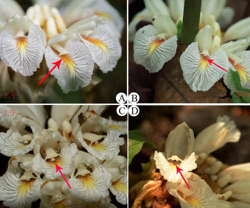 九翅豆蔻的花柱卷曲性。 A. 花柱下垂型上午的状态;B.花柱下垂型下午的状态; C.花柱上举型上午的状态;D.花柱上举型下午的状态