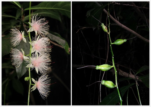 玉蕊(Barringionia racemosa)又名水茄冬、棋盘脚,玉蕊科玉蕊属常绿乔木,高可达 15米。原产非洲、亚洲和大洋洲的热带和亚热带地区。我国天然分布于海南、台湾、云南和两广等地。玉蕊在我国沿海的海南、台湾省有自然分布,但数量极少,常与海滨红树植物混生,有些地方称之为伴红树植物。