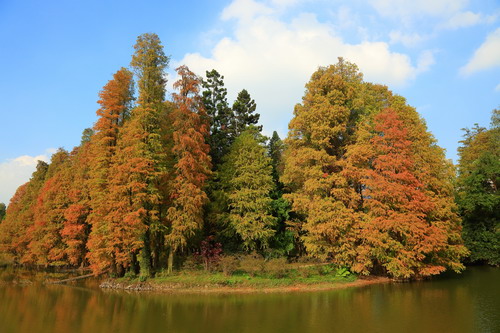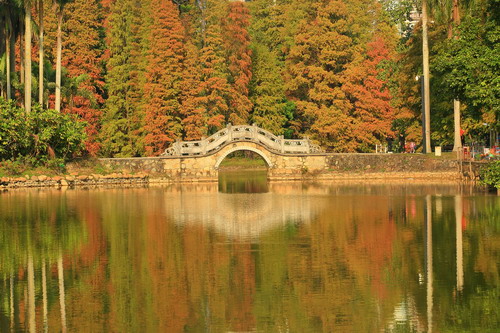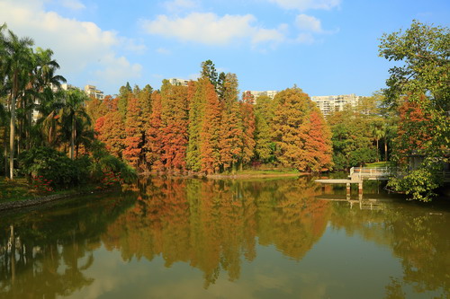 落羽杉、池杉、水松、水杉等都喜欢生长在水边,华南植物园水边有多处观赏红叶的景点——龙洞琪林(孑遗植物区、棕榈园)、水生植物园两岸及湖中心露兜园、科普信息中心前三拱桥边。各个景点的树叶变色程度不同,有的树已基本全部变红,最慢的才则刚刚开始变色。现如今,园内绿叶、黄叶、红叶共存,色彩丰富绚烂。