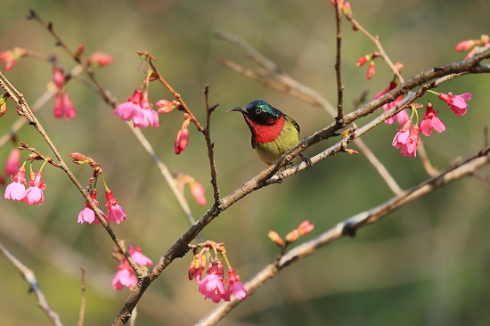 走进华南植物园生物园,满树粉花的大树最容易吸引您的目光,她就是每年1月开花的红花高盆樱花(Cerasus cerasoides var. rubea Yu et Li),又名云南樱花、西府海棠。蔷薇科落叶乔木。叶卵状披针形,托叶线形,基部羽裂;伞形花序有花2~4 朵;萼筒和萼片皆深红色,花瓣深粉红色。开花时满树是花,见花不见叶,艳丽夺目。花粉红色,近半重瓣,垂枝累累颇似红色海棠花,在昆明被称为“西府海棠”。花期为每年1-2月。