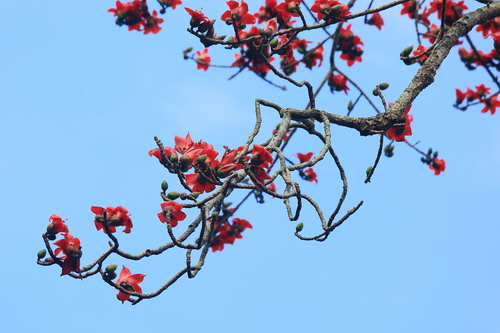 木棉的巅峰风景在春天。木棉先开花,后发叶,早春开花,树干挺拔,掌状叶片亭亭如盖,横看竖看都是美美哒,尔以为足矣,然而最美的风景却在盛花时节,木棉花浓烈绽放,仿佛撼天动地的一团团火焰,通透的红色直冲云霄,有着欲与天公试比高的气势。木棉花开震撼,落花也壮观,凋零时整朵花脱落,有别于花瓣飘零。木棉花瓣肉质,花瓣手感醇厚,被少量绒毛,在上班上学途中,忽然一朵木棉花掉在面前,像是突然蹿出来向你问好的顽童,若有兴致,捡起落花,让它唤醒童心,陪伴你一整天的愉悦。