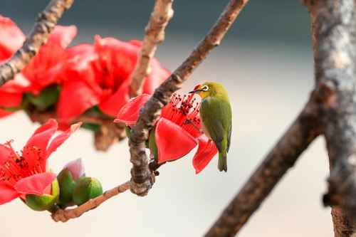 木棉花上采蜜的暗绿绣眼鸟
