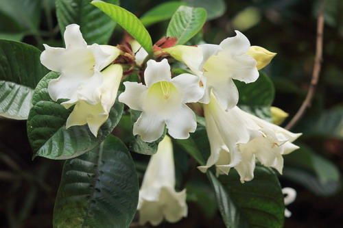 凤梨园的清明花早早的盛放等清明了,清明,清明,天清地明,怎样的花才配得上清明二字。清明花(Beaumontia grandiflora Wall.),夹竹桃科清明花属,叶长圆状倒卵形,嫩枝有锈色毛,叶脉明显,顶生聚伞花序三五成簇,圣洁的白花闪耀枝头,花冠边缘5裂片;雄蕊5枚,着生于花冠筒的喉部。清明花遒劲的木质藤蔓,爬上高高的亭台与林间高大的台湾相思树上,蓬蓬勃勃的向上生长,然后垂下清新柔美的花儿来俯瞰这满园的春色。清明花的根茎坚若磐石,有种顶天立地的“丈夫气”,花儿又非常的素雅,刚柔并济。清明前后盛大绽放的清明花,撷着清香乘着春风捎去对故人的缅怀,是一种应时应景的生命之花。