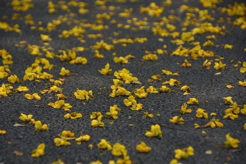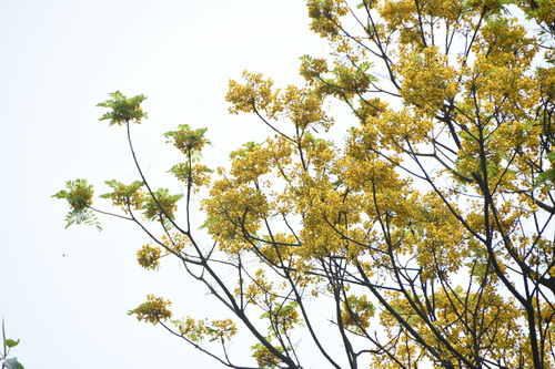 远远就看到了园里不少区域的这一片片金黄,走近了,引入眼帘的是一树树的黄花悠然开于高高的顶上,这是豆科盾柱木属的银珠Peltophorum tonkinense,名为为银珠,花却为金黄色,颇为令人费解,应该叫金珠或者金花才是?!株株银珠黄花轻摇,仿佛笑道“低调,低调!再说,名字也只是一个符号,保留点神秘感,可好?”