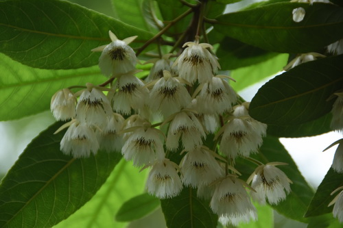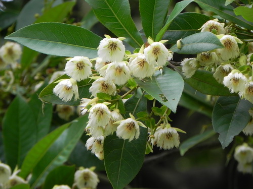 尖叶杜英Elaeocarpus rugosus,又名毛果杜英,杜英科杜英属常绿乔木,它的树干基部的板根,支持着它高大挺直的身躯,叶片椭圆形至倒卵状椭圆形,侧脉每边11-17条,边缘具锯齿,总状花序腋生,平展或稍下垂,看起来朵朵乳白色的小花是生于层层云状的绿叶之下,花瓣5枚,顶端裂成流苏状,花形状如吊钟,又似小仙女临风起舞,飘飘衣袂,仙气十足。