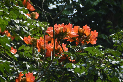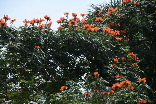 初夏的色彩不仅只有黄色、白色和乳白色,还有如火如荼的红色,比如,开在树顶枝头的火焰,是不断燃烧和释放出来的鎏金火焰喷泉——火焰树Spathodea campanulata,紫葳科火焰树属常绿乔木,奇数羽状复叶,小叶对生,椭圆形至倒卵形,总状花序伞房状,花萼橙黄色,被毛,花瓣红色。于是,你看见一层层火红飞上树顶枝头,花大,形如火焰,色却比花红更浓,在火红的花瓣边沿带条鎏金的纹彩,不似燃烧的火焰又似什么?