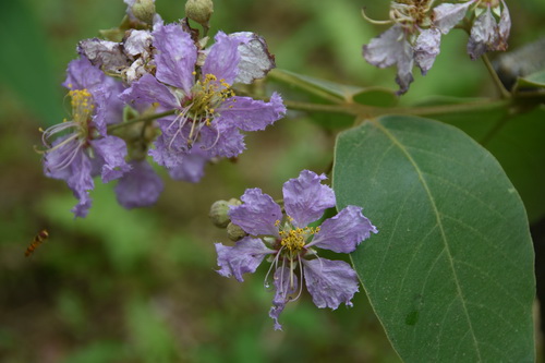 劳氏紫薇Lagerstroemia loudonii,千屈菜科紫薇属常绿乔木,花开得稍早,其叶椭圆形,被毛,侧脉每边7-11条。圆锥花序顶生枝顶,花淡紫色至淡蓝紫色,花瓣6枚,边缘皱曲。