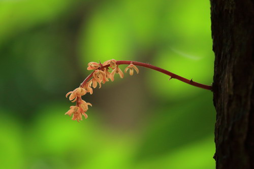 木奶果(Baccaurea ramiflora Lour.),又名火果、树奶果、三丫果,大戟科常绿乔木,高可达12米,胸径60厘米,树皮灰褐色,单叶互生。总状圆锥花序腋生或茎生,雌雄异株,花小,无花瓣,棕黄色,花期3-4月。卵状果实从茎杆上长出,初时黄色,后变紫红色。因果实裂开后呈三瓣状,故在西双版纳被称为“三丫果”,果实味酸甜,成熟时可吃。果期5-8月。大戟科有不少有毒植物,而木奶果却可以吃,想不到吧,自然界奏是这么神奇,总是让人大吃一惊。