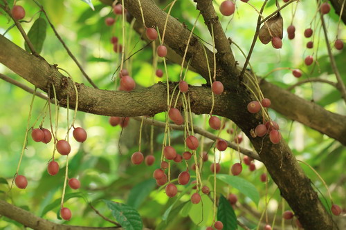 每年六、七月间,一串串指头般大小的扁圆形果实就挂满了大树,从树干基部连到树顶,甚至坠弯枝条,由生至熟,或绿或黄或红;似绿玉雕成的小球、似乳黄的玛瑙珠子、或似鲜红的珊瑚念珠,煞是招人喜爱。其果肉多汁,酸甜可口,生津止渴,消暑解热。剥开果皮后,一口一个,味道相当好,就是酸酸甜甜野生无添加的味道。
