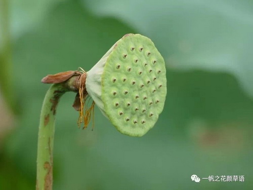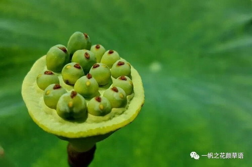 轮到莲子出场了。荷花的雌蕊离生,埋藏于倒圆锥状海绵质花托内,花托表面具多数散生蜂窝状孔洞,受精后逐渐膨大称为莲蓬,每一孔洞内生一小坚果,这就是莲子了。