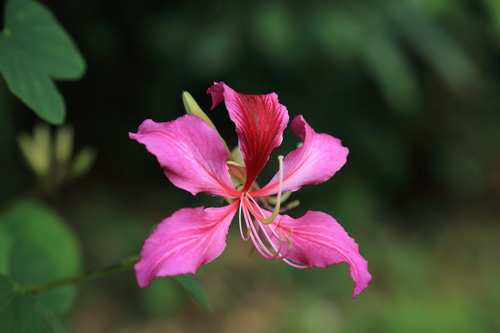 在羊蹄甲家族中,数红花羊蹄甲名气最大了,她就是我们常说的紫荆花——香港特别行政区的区花。红花羊蹄甲(Bauhinia × blakeana),其拉丁学名中间的“×”说明她是杂交种。有研究表明红花羊蹄甲是洋紫荆(B. variegata)和羊蹄甲(B. purpurea)的一种自然杂交种,她的花瓣红紫色,倒披针形,近轴的1片中间至基部呈深紫红色,有能育雄蕊5枚,其中3枚较长,退化雄蕊2-5枚,丝状,极细。由于她是杂交种,她的花粉不能正常发育,无法授粉,开花后不能结果,只能通过压条、扦插或嫁接等无性方式进行繁殖。红花羊蹄甲全年可见花,以冬春为盛,现在正在她的盛花期。