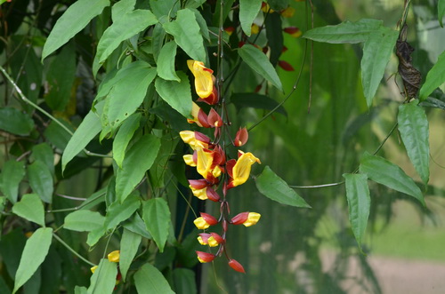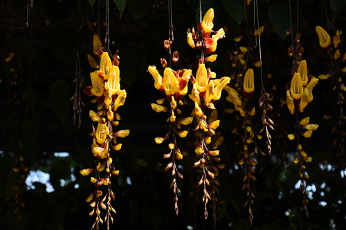 华南植物园2019年底网红之一的红花山牵牛的红花渐渐从枝头褪去,一个个萌哒哒的小鸟般的果实已经有模有样地向四处张望了。此时,在她隔壁,另一种美丽的山牵牛属植物又闪亮登场了,她就是大名鼎鼎的“跳舞女郎”——黄花老鸦嘴Thunbergia mysorensis,爵床科山牵牛属常绿藤本,和红花山牵牛是姐妹花。