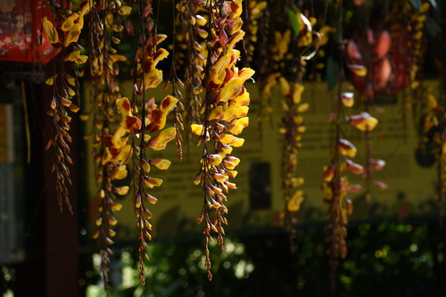 最醒目的是她的花。花开时节,一串串总状花序从叶腋间伸出,悬垂下来,长0.5-1.2米,花序上朵朵硕大美丽的花朵相对而生,弯延的花梗将花朵系在花序上,一串串,串成花帘,一道道,织成美丽的廊架风景。