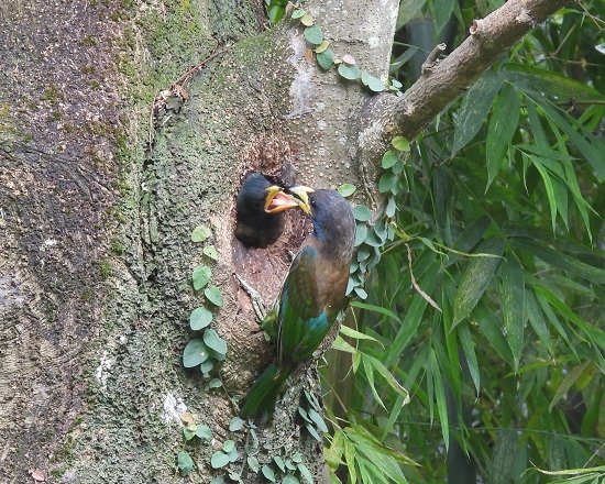 育雏期间,鸟宝宝时不时从树洞里伸出脑袋张望看世界,看到爸爸妈妈飞回来,它们会伸出一张半开的嘴,着急地等待喂食。大拟啄木鸟用嘴叼着食物飞回来后,先立于树洞口,再把整个身子都钻进洞,在洞里喂给小宝宝吃。喂完后,它从洞口一跃而飞,继续找寻食物去。每天不辞劳苦,往返无数趟,来满足鸟宝宝们的需求。大概喂食1个月后,鸟宝宝就陆续出窝学飞,但还需要鸟爸鸟妈继续喂食,直到能够独立觅食为止。