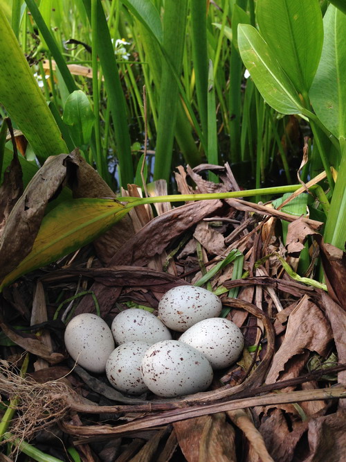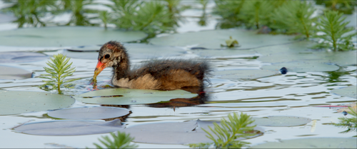 五月的华南植物园水生植物园池塘,微风吹拂,茂密的翠绿水草在随风摇曳,伴随着开着各种颜色花朵的水生植物,组成了一座悠闲安静的湿地花园。在这些植物当中,有叶片仿如一片片镜子漂浮在水面的睡莲,直立的挺水植物如芦苇、香蒲、梭鱼草和大叶皇冠草、鸢尾等。黑水鸡(Gallinula chloropus)的一家就生活在一个每天和花相伴的地方。