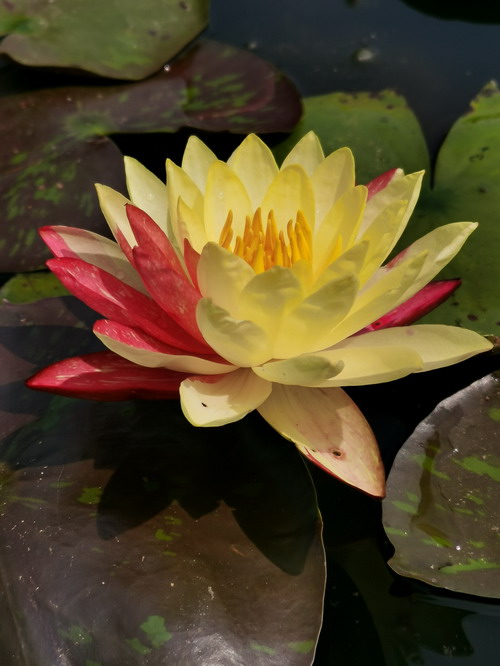 黑水鸡在清晨或傍晚没人的时候会来到池塘左边的方块区域行走,寻找食物。这里是以睡莲为主的水生植物种植池,面积不大,但种类各具特色和具有较高的观赏价值,每当开花时节竞相开放,有洁白无瑕的澳洲巨花睡莲(Nymphaea gigantea),红黄色的著名睡莲万维莎(Nymphaea ' Wanvisa '),粉粉萌萌的香睡莲(Nymphaea odorata),婷婷玉立的泽泻慈姑(Sagittaria lancifolia),小巧玲珑的萍蓬草(Nuphar pumila),婀娜多姿的垂花水竹芋(Thalia geniculata)以及绚丽的路易斯安娜鸢尾(Louisiana Irises)等等。不管经历了多少风风雨雨和寒暑,黑水鸡能在这里留下来并作为长期的栖息地,想必是这里的环境美观、安全宜居的原故,“闲来湖畔清幽处,红喙细梳黑羽裳”。