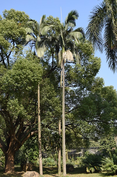 假槟榔,原产澳大利亚,树形优美,集观叶、花、果、茎于一体。对植、列植于公园、绿地,可增添一片热带情趣,是热带、亚热带地区绿化、美化环境的特色树种,在华南地区南部的公园、路边都能看到。