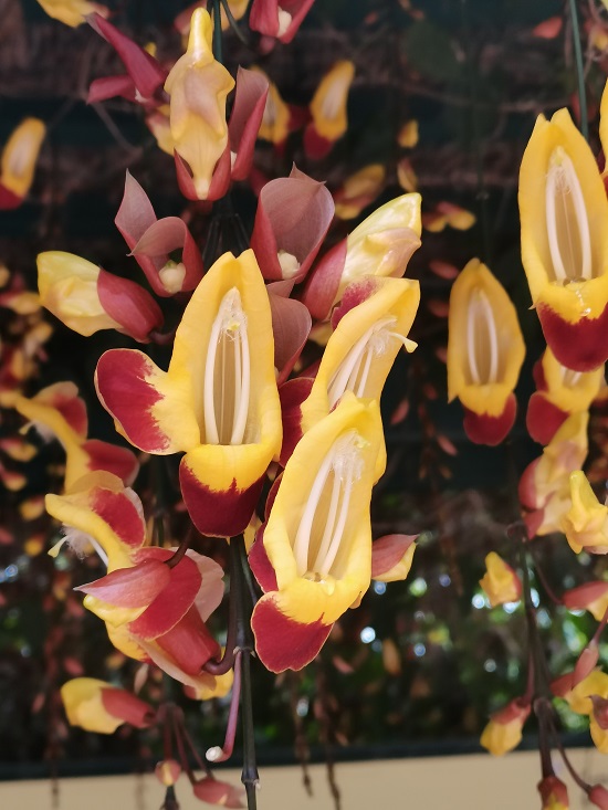 跳舞女郎(Thunbergia mysorensis)属于爵床科(Acanthaceae)山牵牛属,常绿藤本观花植物。总状花序,腋生,花序悬垂性,花萼2片,包覆着1/3的花冠,花冠内侧鲜黄,外缘紫红色,连接成裙状,裂片反卷,尖锄状的花冠,望去宛如张大待食的鸦嘴,惟妙惟肖,所以它又有一个通俗的名字“黄花老鸦嘴”。它自被引进中国后受到极大的欢迎,很快在植物园、公园、庭院里都能见到它的踪影。因为它的花形奇特优雅,四季常青,花期较长,宜于做大型棚架、绿廊、绿亭、露地餐厅等的顶面绿化,是优良的观花藤蔓植物。不过毕竟来自热带地区,跳舞女郎在中国还是比较怕冷,在北方冬天必须在温室里过冬。而在广州,温室里的黄花老鸦嘴的花期比户外的往往会比较早。每年12月份,在足够暖和的温室,它就开始冒出一串串的花蕾。花蕾也很奇特,薄纸般的花萼包裹着花蕾,花蕾张开,橘黄色的花瓣,还有紫红色的裙瓣,就像一个舞女慢慢的将舞裙打开,让我们看清它的容颜,花期一直持续到第二年的六月份。