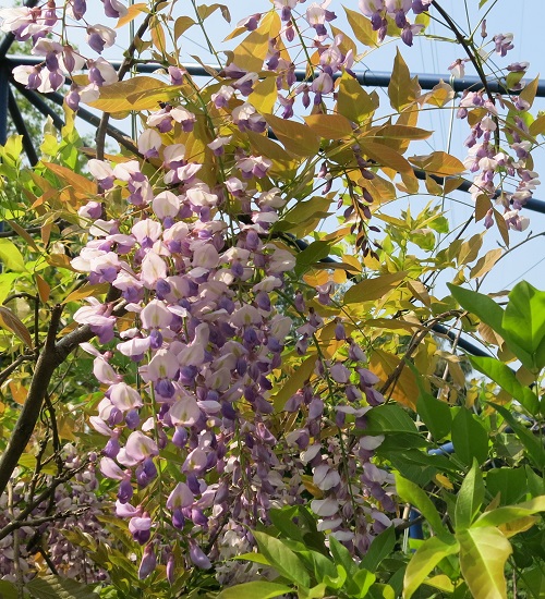紫藤为长寿树藤,也是优良的庭园棚架观花植物,在中国民间有悠久的栽植历史,北方许多地方的紫藤都有数百年以上的树龄。自古以来中国文人都爱为其咏诗作画,唐代李白《紫藤树》日:“紫藤挂云木,花蔓宜阳春。密叶隐歌鸟,香风留美人。”诗人把紫藤同香风美人摆在一起,刻画了紫藤优美的姿态和迷人的风采。