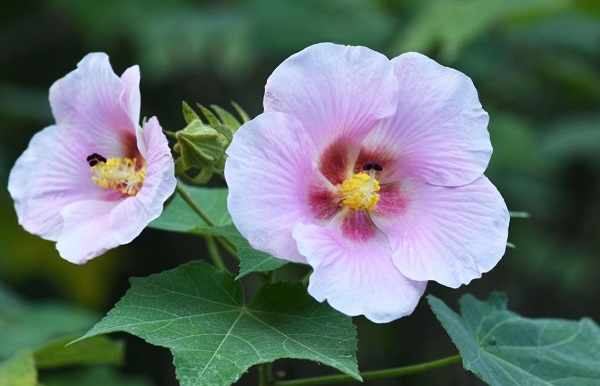 木芙蓉叶宽卵形至圆卵形或心形,常5-7裂,裂片三角形,先端渐尖,具钝圆锯齿,上面疏被星状细毛和点,下面密被星状细绒毛。花单生于枝端叶腋间,有单瓣、重瓣等不同栽培品种、变种等,花大色丽,广州地区每年国庆前后迎来盛花期。