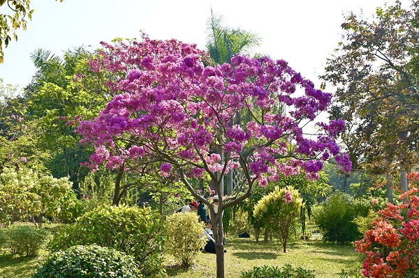 华南植物园木本花卉区开花的紫花风铃木为2020年5月左右新引种栽培,2021年1月份第一次开花,如今年尾又迎来了她的花期,每天吸引了众多游客前来打卡拍照,热闹非凡,也引诱鸟儿们前来采蜜。