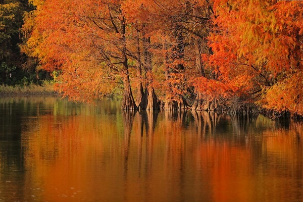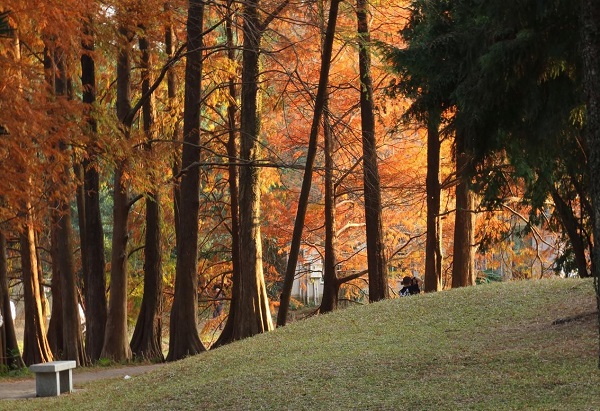 此时此刻,园中独领风骚的孑遗植物落羽杉(Taxodium distichum),是来自北美的落叶乔木,犹如羽毛般的叶丛、南极仙翁般的膝根,半天朱霞的身影拨动无数人的心弦。其树形更是异常优美,你看那一株株落羽杉,挺立着如等腰三角形的身板,像极受检阅的队伍,整齐归一地伫立在宁静的湖边。而其独特的树形已悄悄暴露她年龄的秘密啦。原来,50年生的落羽杉其实还只是幼龄至中龄阶段,说是棵树宝宝也不足为过。而生长50年以上落羽杉,有些植株会逐渐形成不规则的宽大树冠。所以,当我们偶尔在一列三角形中看到一两棵不规则树冠时,那不是长错了的特别品种,是落羽杉队列中的老首长啦。