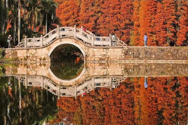 时光荏苒,雅致的水榭、古朴的琪林桥已分别被列为“广州市历史建筑”及“广州市传统风貌建筑”,她们如慈祥的老祖母,慈爱地凝望着她的儿孙们。挺拔的大王椰子、调皮的鱼尾葵、稳重的落羽杉,她们婆娑的树影在水平如镜的湖面交织着,追逐着,打闹着,仿佛向人们发出邀请:一年好景君须记,一定不要辜负如今这世外桃源的无边美景。