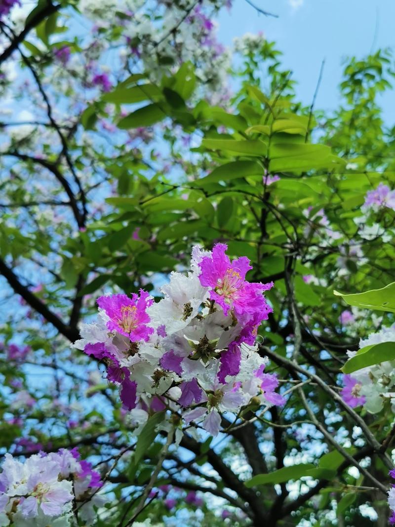 盛开的大花紫薇是六月盛事,无论临江大道、荔城大道、新港东路还是大学城南二路、开创大道等路段,近日在广州街头处处都能遇见浪漫。记者从华南植物园获悉,稀有的大花紫薇“双色”品种已在华南植物园绽开。