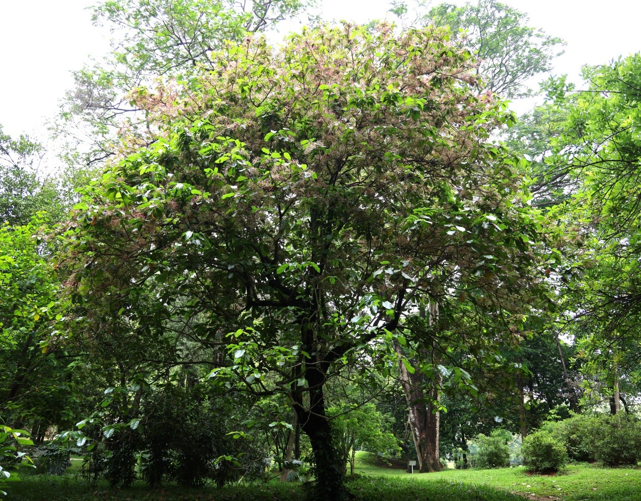 华南植物园中心大草坪有一栋在古树名木掩映下的岭南园林建筑——办公楼,绿顶白墙的外观,仿中式琉璃坡屋顶,水刷石外墙,它也是广州市历史建筑。办公楼一侧有一株香苹婆,香气缭绕,树枝上还爬满了薜荔藤蔓,仿佛让时光都慢了下来。《中国植物志》说香苹婆花有臭味,香与臭也是见仁见智,个人感觉还比较宜人,捡了地上的落花放在书桌,香了好久。