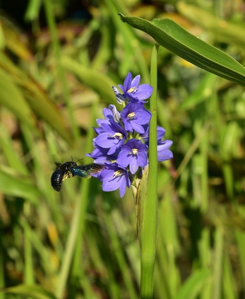 高亭雨久花(Monochoria elata Ridley),为雨久花科雨久花属水生植物,分布于泰国、马来西亚,缅甸等热带地区沼泽湿地;在我国,只分布于海南。与同属雨久花等低矮小草本植物比较,高亭雨久花植株高可达1.7米,属雨久属植物中的“巨人”。高亭雨久花特征明显,叶片基生,略微倾斜伸出水面,宛如斜插于水中的战戟;花亭高高直立于水面,数十朵蓝紫色小花总状聚生于花序上。与常见的同属雨久花科的水景植物梭鱼草主要于春夏季节盛放不同,高亭雨久花盛放于秋风起后的凉爽季节,花也明显大很多。
