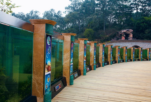 沉水植物种类丰富,形态多姿多彩。植物水族馆共展示了26个科300多种沉水植物,游人可直观地欣赏奇妙的水下植物世界。37个大型展示箱组成亚洲水草区、非洲水草区、大洋洲水草区、美洲水草区和欧洲水草区等5个区域,依不同水域和生境特点营造水下景观,构思巧妙,令人赞叹。