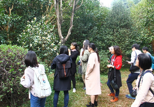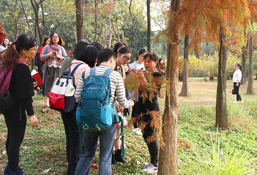 首先,科普老师带领学员们参观了山茶园,为她们讲解山茶花的特点和习性,陪伴大家一一细品正在盛放的十八学士、茶梅、油茶、越南抱茎茶等茶花。通过老师通俗易懂和生动有趣的讲解,学员们了解到原来十八学士是因花瓣接近十八层才得此文雅之名;越南抱茎茶的叶子紧贴着茎生长,茎叶相亲相爱搂抱依偎;而茶梅则因叶如茶花似梅而得名,每种植物的名字背后竟隐藏着这么多的小秘密。“植物熊猫”——金花茶现世的曲折经历和科学家为保护植物所付出的努力和艰辛的故事令学员感动不已;还有白花油茶的花洁白美观、种子油量丰富,是良好的食用油植物;饮用茶那小小而不起眼的植株却用鲜嫩的叶片幻化成世界三大饮料之一……山茶科这个大家族成员的颜值、才气及接地气,让人刮目相看。赏完茶花后大家来到水生植物园湖畔赏红叶。时光正好,叶子正红,灿烂阳光下红叶冬景美不胜收,老师教大家如何区分落羽杉、池杉、水杉、水松这几种红叶树种,让学员们细致观察它们的叶子结构和着生方式:落羽杉的小叶是条形互生的,水杉的叶子也是条形却为对生,池杉是钻形叶,水松有鳞形、钻形和条形多种叶形并存,学员在赏花观景的同时学到了丰富的植物学知识。