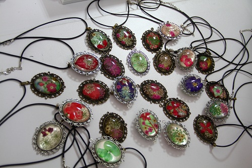 随后学员们来到课室学习微波压花技术,老师教授压制单瓣薄花的方法并示范,然后由学员动手体验将一朵鲜花在短时间内压制成一朵形、色、韵俱在的干花,压好的精致干花令学员们爱不释手。在老师的指导下,学员们进行压花饰品“时光宝石”项链的制作,用花为材自由设计图案,制作出一颗颗独一无二的“时光宝石”。学员们对自己亲手制作的漂亮压花饰品充满了成就感。