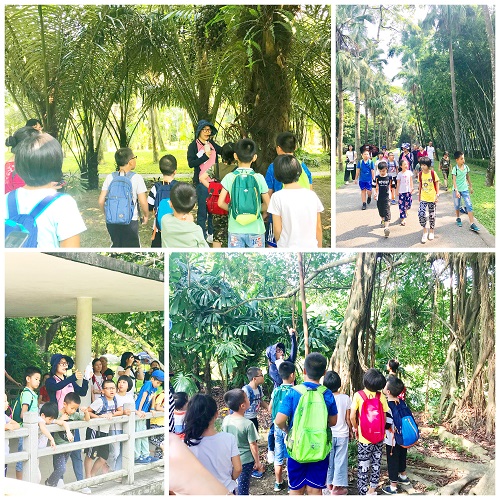 植物知识课堂的第一站,科普老师带领大家认识了蒲葵、大果直叶榈、三药槟榔、砂糖椰子、霸王榈、椰子树等棕榈科的植物叶片、花序和果实,其中还簇立着红脉葵、黄脉葵、蓝脉葵棕榈科“三姐妹”。棕榈园中间种的黄榕、水石榕、华南毛蕨等植物,叶片与棕榈科植物叶片迥然有别。在“一树成林”的榕树旁,科普老师介绍榕树生长特性和自然界中植物的“绞杀”现象,大家对植物和形态各异的叶片及其生境有了感性的认识和直观印象。出了棕榈园,拱桥水边相接处,到了第二站龙洞琪林。水榭边是青翠的落羽杉树,叶片如同飞羽,树干旁布满了呼吸根,称为“膝根”,是落羽杉伸出地面呼吸的一个个鼻子,形状宛如“国际象棋”,孩子们在中间玩耍起来,只是不知道鼻子被挠痒后,落羽杉是否喷嚏连连?进入琪琳湖边,两边栽种着水杉、池杉、南洋杉、落羽杉,秋天树叶呈现不同颜色,是欣赏秋色的好去处。科普老师特意介绍了琪琳两边的园林造景是采用借景之法,让人在湖边看去,远远没有尽头。第三站,在通往科普中心的竹径上,孩子们了解了世界最粗大的竹子和熊猫食用的竹子名称,转入阿江榄仁路,科普老师向大家介绍两旁栽种着叶大姿美的阿江榄仁树,这是优良的行道树,木材坚硬,可用于造船、建房等,叶子是生产塔萨尔丝的柞蚕的食物,茎皮含有苷、大量的类黄酮、单宁和矿物质,具有活血的药用价值,其翅果也非常有特色。
