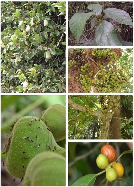 各式各样的榕果,从上往下,左图:薜荔、苹果榕,右图:五指毛桃、聚果榕、青果榕、细叶榕