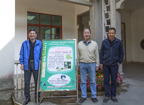 琪林科学讲座海报前,主讲人陈贻竹教授(中)与园艺中心副主任夏汉平(左)、廖景平(右)合影