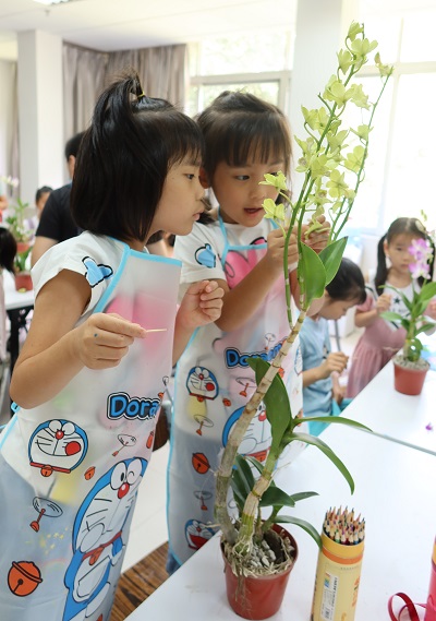 活动开始,由科普导师导赏园区风光,步行至兰园后,参加活动的小朋友和家长们跟随专业老师的讲解,学到了不少融入生活的科普知识,知道了制作香草冰淇淋的原料有香荚兰,父亲节或者爸爸生日时可以送秋石斛,穿漂亮黄色小裙子的是文心兰等。孩子们在兰园一人领到了一盆秋石斛作为活动材料。在后续写生课堂里,大家仔细观摩,认真画出了自己心中最美的秋石斛。最后的环节是授粉实验,用授粉工具小心翼翼的取出秋石斛的花粉,完成人工杂交授粉。