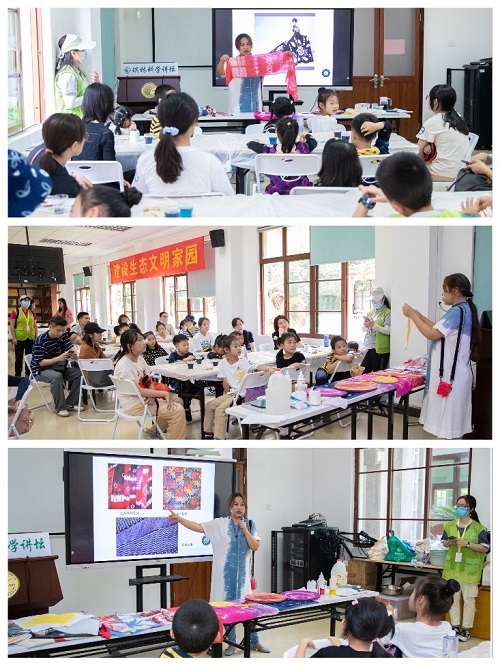 回到课室,科普老师为大家进行了扎染专题讲解、演示与制作。扎染是一种古老而简易的染色工艺,是将纺织品面料运用打结、捆绑、缝缀等不同扎结方法进行处理,然后进行染色的手工艺术。扎染具有独特的艺术个性,由于被捆扎的面料受到轻重、松紧的不同压力,在染色过程中使其被染液浸渗的程度产生变化,从而形成深浅虚实的色晕纹理和神奇多变的肌理效果。科普老师为大家现场展示了各种扎染作品、或奇幻抽象、或清新淡远,美丽缤纷,大家纷纷啧啧称奇。尔后,又演示了不同图案的扎结方法和注意事项。最后,现场提取了苏木的红色色素、姜黄的黄色色素和蓝草浸渍发酵后的靛蓝色。