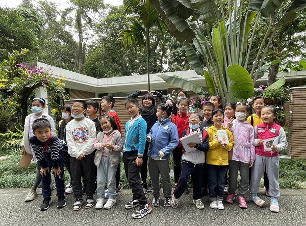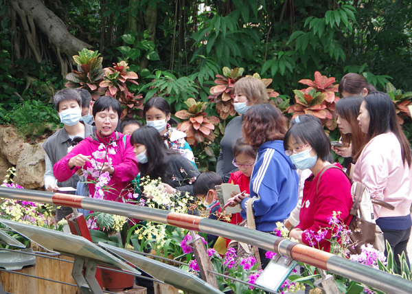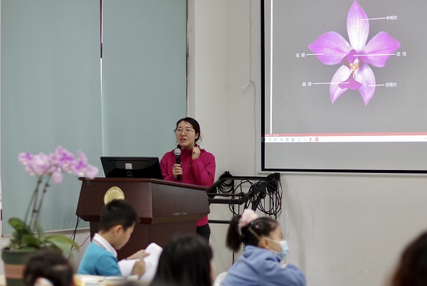 兰花展主场在温室,迎面就是大型沉浸式兰花体验展区,各式素雅的、端庄的、花枝招展、遗世独立的兰花错落有致的展现在眼前。在老师引导下,大家赞叹兰花美丽之余,又仔细观察记录起来。兰花结构独特,其中间的花瓣特化成形状特殊、色彩斑斓的唇瓣,上面连着合蕊柱(雄蕊、雌蕊合生在一起),专用于引导或引诱昆虫帮其授粉,这种结构在植物界中是独一无二的。在漫长的岁月里兰花演化出各种匪夷所思的花朵结构和授粉机制,使这种曾与恐龙同时代的古老物种延绵至今,让我们仍能欣赏其美丽,赞叹其智慧!