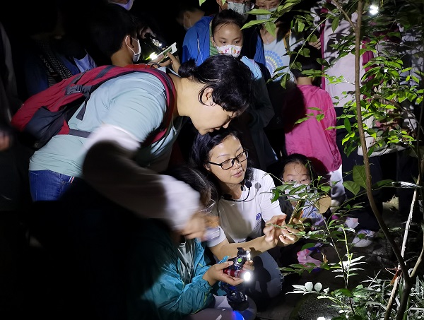 “夜幕下的精灵”夜观活动恰逢小雨,但30位探险家们并未因此退缩。即便眼睛的功能在黑暗里受到了限制,大家仍努力用全身心来感受这黑夜的魅力——远处有蛙合唱、草丛有螽斯低鸣,鼻间有暗香浮动、脸颊上有清凉空气滋润,走在幽暗的林间,不时有流萤一盏、两盏飘过,大家看到了晚出的蝉在奋力蜕壳羽化,白额高脚蛛以闪电之势捕获了一只白蚁,一只霸气的黑眶蟾蜍、一只巨大的纺织娘都在静静地等待它们的新娘。初夏的夜观,神秘又美好。