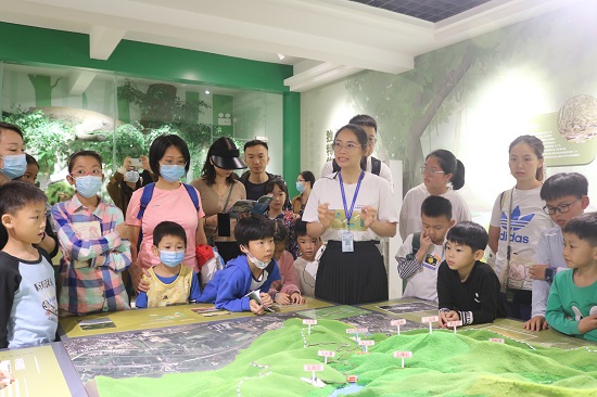 接着,在戴玉映老师的带领下,参与者们走进鼎湖山自然教育中心了解保护区的发展历史、地理位置、生态资源、生态保护措施和科学研究成果等。期间,戴老师利用沙盘模型让大家“窥见”鼎湖山保护区的全貌,还特别介绍了鼎湖山保护区历年来的重大事件、历史年鉴、重点珍稀保护动物标本以及以自然保护区为研究地点的科研成果,大家尤其对打破经典传粉机制的黄花大苞姜产生浓厚兴趣。