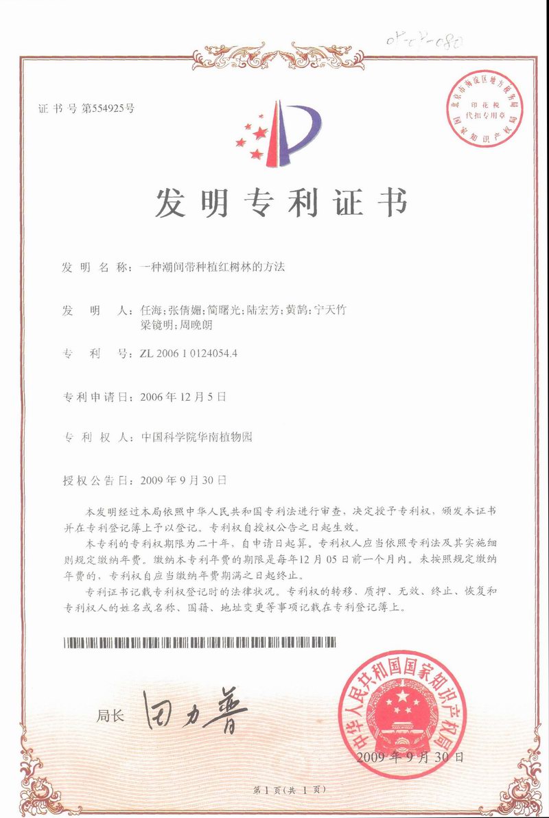 由华南植物园任海研究员等申请完成的“一种潮间带种植红树林的方法”于近日获国家发明专利授权(专利号: ZL200610124054.4)。 大部分红树植物主要靠其胎生苗进行繁殖,通常将其直接种于泥滩。当前,我国东南沿海兴起营造红树林的高潮,但红树林乡土树种在中高潮带的裸滩上造林成活率很低,甚至不能存活。主要是由...
