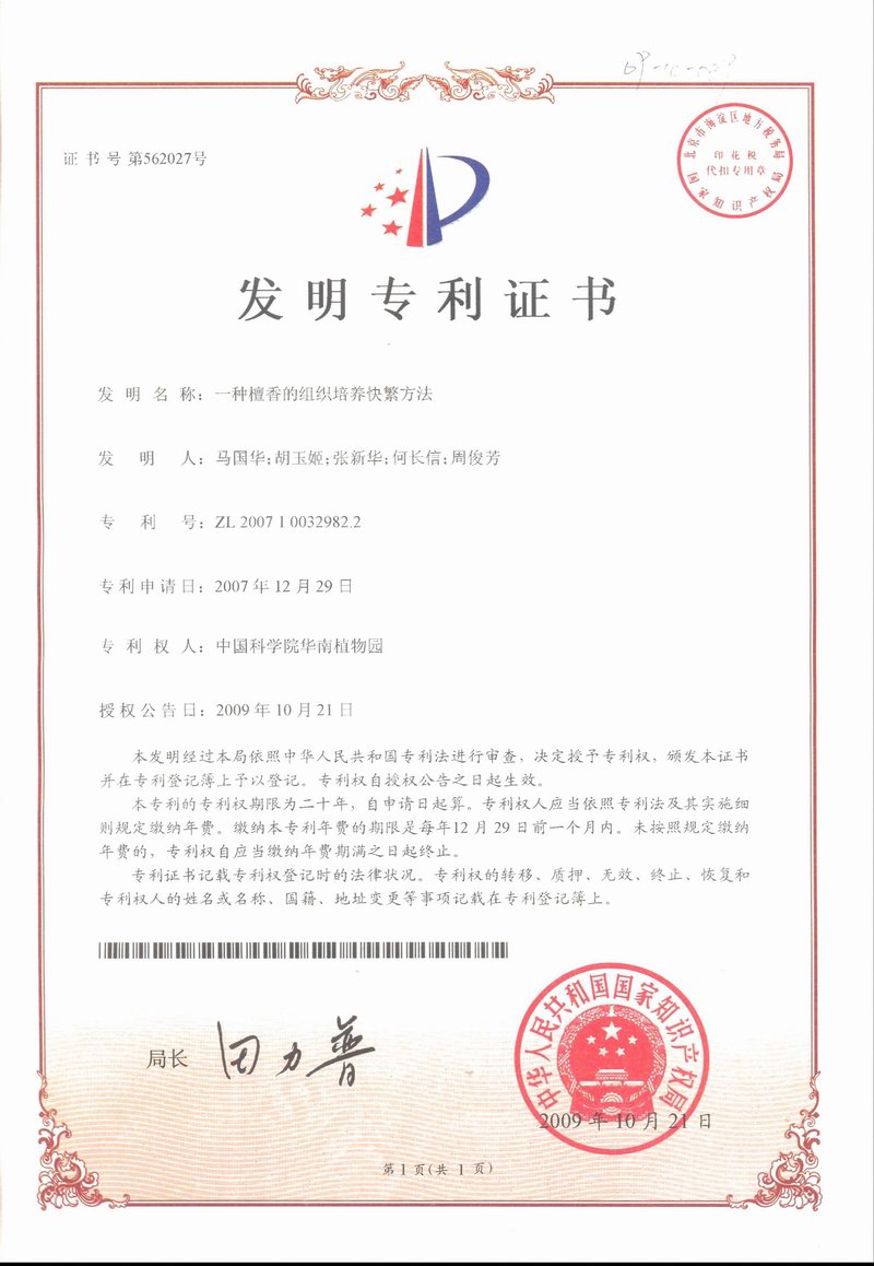 由华南植物园马国华博士等完成的“一种檀香的组织培养快繁方法”于2009年10月21日获国家发明专利授权(专利号:ZL 200710032982.2)。 檀香木是提取檀香油的原材料,它含有α和β檀香醇等成分,可配制香水、香料、香皂和香熏等。檀香油具有抗菌成分,作为传统中药,檀香油可治疗皮肤病如痔疮、粉刺、痢疾、淋病等一...