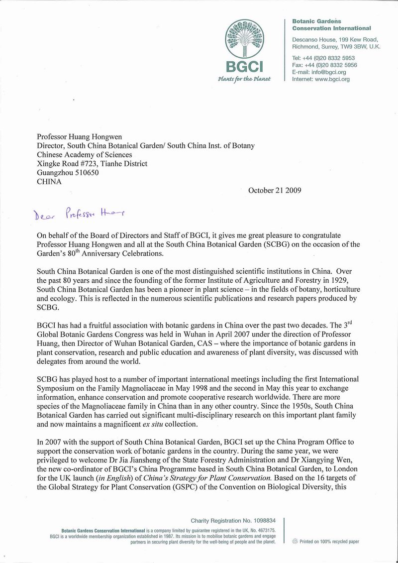 | BGCI秘书长Sara Oldfield为华南植物园成立80周年发来贺信