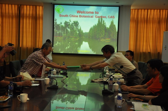华南植物园主任黄宏文、党委书记任海及BGCI中国项目办公室和园艺中心等相关负责人热情接待了代表团一行并开展会谈。黄宏文首先向代表团简单介绍了华南植物园的概况、研究领域和未来的发展规划。代表团随后就中国植物保护战略的起草和制订、现在的执行情况、中国植物园就中国植物保护战略的分工合作、执行过程中的问题以及未来的工作等方面与华南植物园进行了深入探讨。