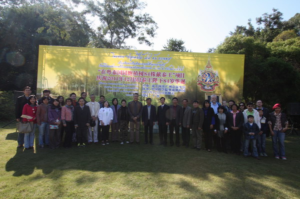 12月4日,由泰国驻广州总领事馆主办、中国科学院华南植物园协办的“庆祝泰国国王84岁华诞植树活动”在华南植物园隆重举行。泰国驻广州总领事馆全体官员、泰国在穗企业家与知名人士、泰国诗丽吉王后植物园的专家、部分泰国在穗留学生以及其他社会各界人士400余人出席,华南植物园主任黄宏文、党委书记任海及部分职工代表参加了活动。