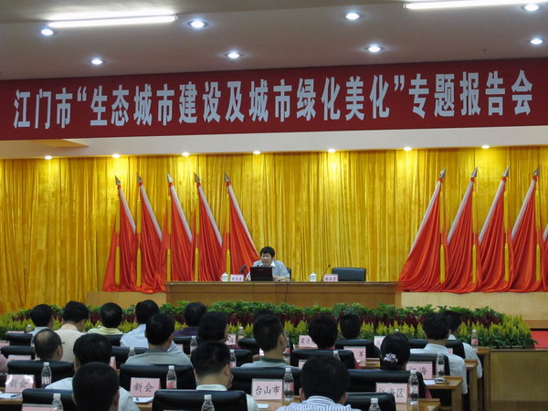 蒋厚泉在报告中积极探索了建设和管理分离的新理念新思路,高标准建设、精细化管理,在高层次、高水平上提升城市形象;突出抓好生态、水系和林带建设,打造路水林景相依、河湖水贯通的绿色景观带建设,全面提升江门市的城市品味;要坚持以人为本推进生态城市建设,从满足居民的舒适感和宜居感出发,提升市民的幸福指数,让市民享受到生态城市建设的成果。他还强调,城市生态环境建设要把握关键环节,在规划中突出城市个性特点,多元化体现城市风格,真正做到“有看头、玩头、住头、买头、说头、学头、享头、行头、回头”。专题报告对建设生态城市提出的鲜明观点,为与会人员上了一堂生动的实用课,讲座现场气氛活跃、高涨,形象生动的案例分析讲解受到了与会代表的一致好评。