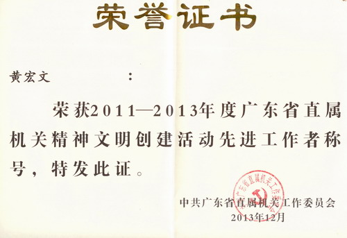 黄宏文研究员荣获“广东省直机关精神文明建设先进工作者”
