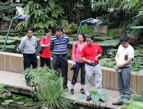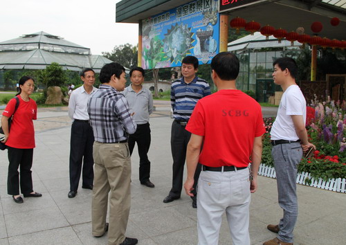 随后,湖南省森林植物园代表团一行重点参观了世界植物奇观――温室群景区。蒋利洪高度赞扬了景观温室的规划设计、造景艺术和园林布局,并就植物园建设、植物保护和植物资源利用等问题与陪同人员进行了交流与探讨。